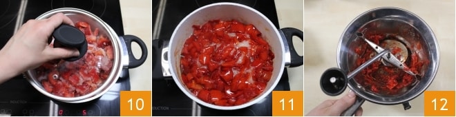 Decken Sie den Topf mit einem Deckel ab 10, wobei Sie darauf achten, eine Öffnung für den Dampf zu lassen, und kochen Sie etwa eine Stunde. Nutzen Sie diese Zeit, um die Gläser und Deckel zu sterilisieren, wie in den Richtlinien des Gesundheitsministeriums am Ende des Rezepts angegeben. Nach diesem Vorgang kehren Sie zu Ihrer Marmelade zurück: Schalten Sie die Flamme aus 11 und passieren Sie alles durch die Flotte Lotte 12, wobei Sie sich lange auf die Schalen konzentrieren, um so viel Fruchtfleisch wie möglich herauszuholen.