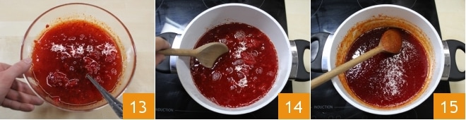 Wenn Sie das Sieben der Paprika beendet haben, erhalten Sie ein gleichmäßiges Fruchtfleisch 13. An diesem Punkt stellen Sie die Mischung erneut auf niedrige Flamme und kochen Sie, wobei Sie oft rühren 14 und, wenn nötig, den weißen Film entfernen, der sich während des Kochens auf der Oberfläche bilden kann. Kochen Sie 30 Minuten lang, bis die Marmelade dick geworden ist 15.