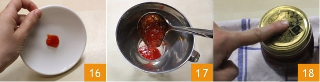 Nach 30 Minuten machen Sie den Teller-Test: Nehmen Sie etwas von der Mischung mit einem Löffel und lassen Sie einen Tropfen auf einen Teller fallen, der kompakt bleiben muss 16, dies ist der Beweis, dass Ihre Konfitüre fertig ist. Wenn der Tropfen verrutscht und nicht kompakt ist, fahren Sie mit dem Kochen fort, bis die gewünschte Konsistenz erreicht ist und rühren Sie dabei häufig um. Schalten Sie die Flamme aus und füllen Sie die heiße Marmelade in die zuvor sterilisierten Gläser: Helfen Sie sich mit einer Schöpfkelle und einem Trichter für Konfitüren 17. Füllen Sie die Gläser, dabei einen Zentimeter vom Rand frei lassen, dann schrauben Sie die Deckel gut zu, aber ohne sie zu fest zu ziehen. Lassen Sie abkühlen: Mit der Wärme der Marmelade wird sich das Vakuum bilden, das es ermöglicht, das Produkt lange zu lagern. Wenn die Gläser abgekühlt sind, überprüfen Sie, ob das Vakuum korrekt entstanden ist: Sie können auf die Mitte des Deckels drücken und, wenn Sie das klassische "Klicken" nicht hören, ist das Vakuum entstanden 18. Ihre scharfe Paprikamarmelade ist bereit, genossen zu werden!