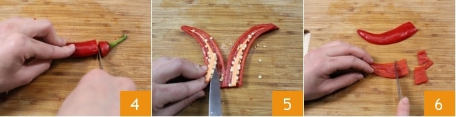 Ziehen Sie sich jetzt ein Paar Handschuhe an und verfahren Sie genauso mit den Paprika: Waschen Sie sie, entfernen Sie den Stiel 4, halbieren Sie sie längs und entfernen Sie die Kerne 5, schneiden Sie schließlich auch die Paprika in Stücke 6.