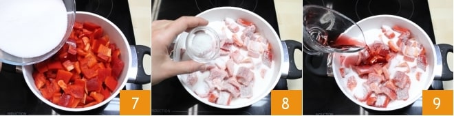 Geben Sie die Paprika und die Paprika-Stücke in einen großen Topf, fügen Sie den Zucker 7, das Salz 8 und den Wein 9 hinzu und kochen Sie auf sehr niedriger Flamme.