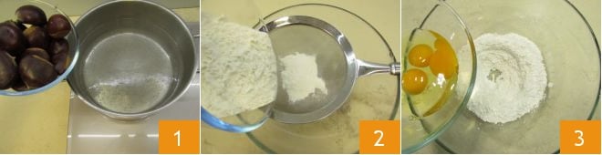 Um die Kastanien- und Wurstravioli zuzubereiten, beginnen Sie mit dem Kochen der Kastanien: Geben Sie die ganzen Kastanien in einen Topf mit kochendem Wasser 1 und kochen Sie sie 30 Minuten lang. In der Zwischenzeit bereiten Sie den Teig vor: Sieben Sie das Mehl in eine Schüssel 2, fügen Sie die Eier hinzu 3.