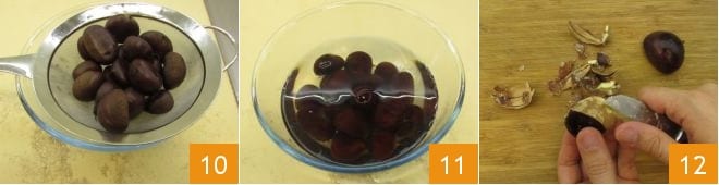 Gießen Sie sie ab 10 und lassen Sie sie in einer Schüssel mit kaltem Wasser abkühlen 11. Sobald sie abgekühlt sind, schälen Sie sie 12 und stellen Sie sie beiseite.