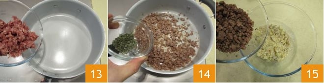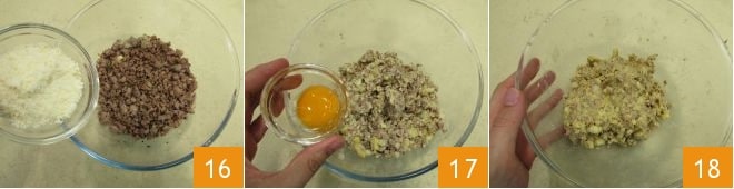 würzen Sie mit geriebenem Grana Padano 16, beginnen Sie zu mischen und fügen Sie dann das Ei hinzu 17 und kneten Sie die Füllung, um sie zu vermengen 18.