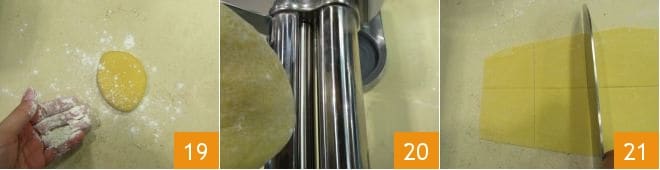 Nehmen Sie den Teigball zurück, teilen Sie ihn mit einer Teigkarte in Stücke, mehlen Sie jedes Stück ein 19, nehmen Sie das erste Stück (die anderen können Sie in Frischhaltefolie eingewickelt lassen, bis Sie sie ausrollen) und führen Sie es durch die Nudelmaschine 20, arbeiten Sie es von der größten Dicke bis zur vorletzten, indem Sie den Teig mehrmals mit dieser letzten Dicke durchziehen, bis Sie Blätter von 2-3 mm Dicke erhalten. Teilen Sie das Blatt in der Mitte und schneiden Sie Quadrate von etwa 5x5 cm 21.