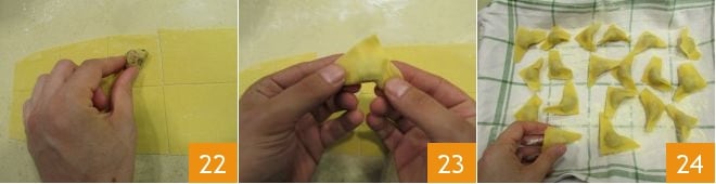 Legen Sie in die Mitte jedes Quadrats eine Kugel Füllung 22. Falten Sie den Teig, indem Sie zwei gegenüberliegende Ecken zusammendrücken, um Dreiecke zu bilden 23, und versiegeln Sie die Ränder gut, indem Sie mit den Fingern leicht drücken. Legen Sie die fertigen Ravioli auf ein mit einem bemehlten Küchentuch bedecktes Tablett 24.