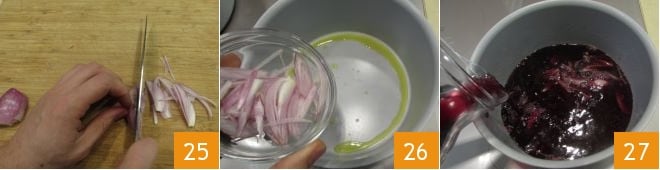 Stellen Sie einen Topf mit reichlich Wasser auf den Herd, das später zum Kochen der Ravioli benötigt wird; salzen Sie es und bringen Sie es zum Kochen. Schälen Sie in der Zwischenzeit die Schalotte und schneiden Sie sie dünn 25. Erhitzen Sie das Olivenöl in einem Topf, fügen Sie die Schalotte hinzu 26 und lassen Sie sie einige Minuten anbraten, dann bedecken Sie sie mit dem jungen Wein 27 und kochen Sie sie bei mittlerer Hitze 30 Minuten lang, um die Soße zu reduzieren.