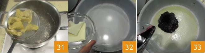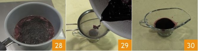 Wenn die Soße eingedickt ist, schalten Sie die Hitze ab 28 und filtern Sie sie durch ein Sieb (29-30).