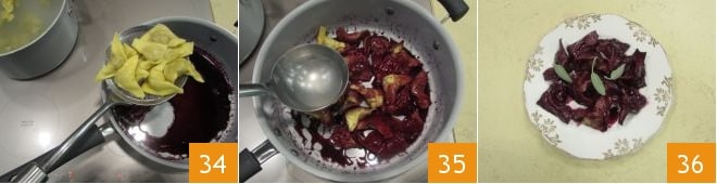 Sobald die Ravioli fertig sind, schöpfen Sie sie mit einem Schaumlöffel direkt in den Topf mit der Soße aus jungem Wein 34, verlängern Sie sie mit einer Kelle Kochwasser 35 und lassen Sie sie kurz anbraten, gerade lange genug, um die Ravioli zu würzen. Servieren Sie die Kastanien- und Wurstravioli sofort, indem Sie das Gericht mit frischen Salbeiblättern aromatisieren 36.