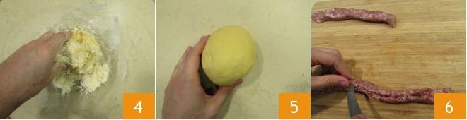 Kneten Sie den Teig mit den Händen 4, bis Sie einen kompakten Teigball 5 erhalten, wickeln Sie diesen in Frischhaltefolie ein und lassen Sie ihn 30 Minuten an einem kühlen, trockenen Ort ruhen. In der Zwischenzeit kümmern Sie sich um die Wurst: Schneiden Sie den Darm in Längsrichtung ein 6