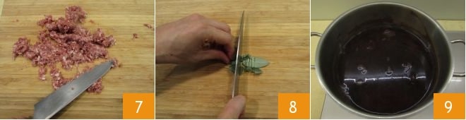 und ziehen Sie ihn ab, hacken Sie die Wurst 7 und die Salbeiblätter 8. In der Zwischenzeit sind die Kastanien fertig gekocht 9.