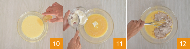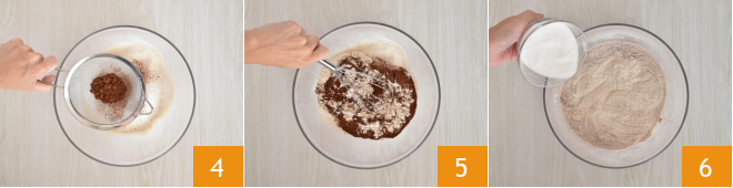Fügt das Kakaopulver 4 hinzu und nachdem alles gesiebt wurde, vermischt es zum Angleichen 5. Schließlich eine Prise Salz und den Zucker hinzufügen und erneut vermischen 6