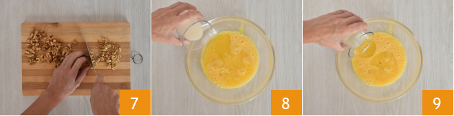 Zuletzt die Walnüsse mit einem Messer zerkleinern 7 und zu den flüssigen Zutaten übergehen. In einer anderen Schüssel die Eier aufschlagen und die Milch 8, das Pflanzenöl 9 eingießen.