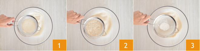 Um die Kastanientörtchen zuzubereiten, beginnen wir damit, das Mehl 00 1, Kastanienmehl 2 und Backpulver 3 in eine Schüssel zu sieben.