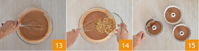 Die zweite Hälfte einfüllen und weiter rühren, bis eine kompakte, aber glatte Masse entsteht 13. Auch die Walnüsse hinzufügen und ein letztes Mal umrühren 14. Den Teig in 4 bereits gebutterte und bemehlte Donut-Formen von 13 cm Durchmesser füllen 15.