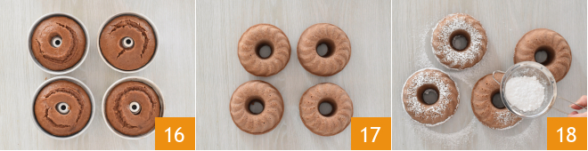 Im vorgeheizten Umluftofen bei 170° für etwa 25 Minuten backen 16. Nach dem Backen die Törtchen herausnehmen, vollständig abkühlen lassen und dann aus den Formen nehmen 17. Vor dem Servieren die Oberflächen der Kastanientörtchen nach Belieben mit Puderzucker bestreuen 18.