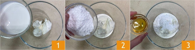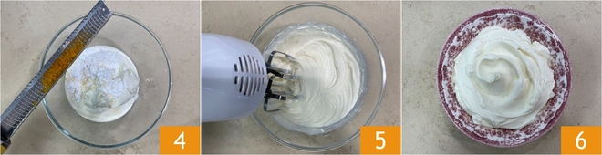 Um die Mascarponecreme ohne Eier zuzubereiten, geben Sie den Mascarpone und die Sahne 1 in eine Schüssel, dann fügen Sie den Puderzucker 2 und den Grand Marnier 3 hinzu.