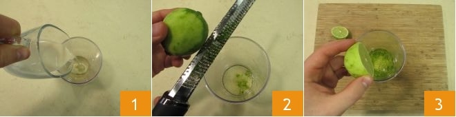Um das Meeres-Cuoppo mit Mojito-Mayo zuzubereiten, beginnen Sie mit der Zubereitung der Mayo. Geben Sie das Öl, die Sojamilch 1, das Salz in den Behälter eines Mixers, reiben Sie die Limettenschale ab 2 und pressen Sie den Saft einer Hälfte aus 3.