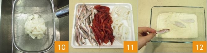 und schließlich die Tintenfischringe 10. Legen Sie sie auf ein Tablett 11. Erhitzen Sie reichlich Öl auf 190° in einem Topf und währenddessen mehlen Sie die Rotbarben mit Grieß 12.