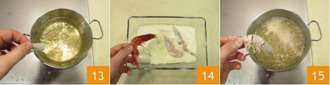 Nach und nach tauchen Sie 5-6 Stücke gleichzeitig ein und lassen sie ein paar Minuten goldbraun werden 13. Danach mehlen Sie sofort die Garnelen 14 und tauchen sie ins Öl 15.