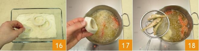 Und dasselbe für die Tintenfischringe (16-17). Nach und nach mischen Sie mit einem Schöpflöffel 18.