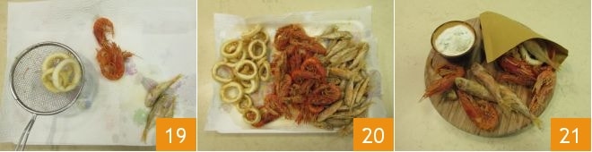 und dann abtropfen lassen, sobald sie anfangen goldbraun zu werden 19. Lassen Sie sie auf Küchenpapier abtropfen und fahren Sie fort, bis Sie alle Zutaten fertig haben 20. Platzieren Sie sie in Papierkegeln und die falsche Mayonnaise in kleinen Schalen: Das Meeres-Cuoppo mit Mojito-Mayo ist fertig, servieren Sie es heiß 21!