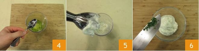 Fügen Sie den Rum hinzu 4 und erhalten Sie eine dicke Creme mit einem Stabmixer 5. Übertragen Sie die Mischung in eine Schüssel und fügen Sie die Minze hinzu, die Sie mit einem Messer kleingehackt haben 6.