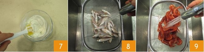 Rühren Sie um und stellen Sie die Mischung dann in den Kühlschrank 7. In der Zwischenzeit spülen Sie die Fische gut ab, am besten einzeln, also die Rotbarben 8, die Garnelen 9.