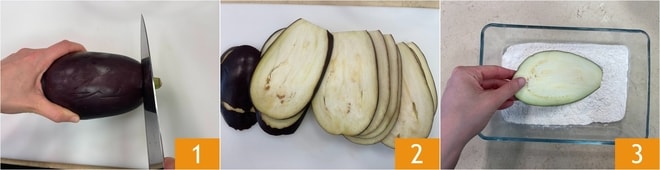 Um den Meeres-Parmesan zuzubereiten, beginnen Sie zuerst mit den Auberginen: Waschen Sie sie und entfernen Sie den Stiel 1, dann schneiden Sie sie in dünne Scheiben von etwa 4-5 mm Dicke 2. Erhitzen Sie inzwischen das Pflanzenöl in einem großen Topf. Mehlen Sie die Auberginen 3.