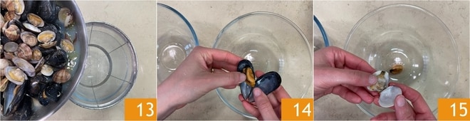 Sobald sie fertig sind, seihen Sie sie durch ein Sieb ab 13 und bewahren Sie die Garflüssigkeit auf 13. Schalen Sie die Muscheln 14 und die Venusmuscheln 15.