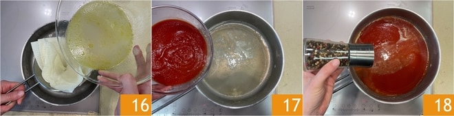 Filtrieren Sie die Garflüssigkeit von Muscheln und Venusmuscheln und sammeln Sie sie in einer Pfanne 16, bringen Sie sie dann zum Kochen und fügen Sie die Tomatensauce hinzu 17, salzen und pfeffern Sie 18. Kochen Sie ohne Deckel für 20 Minuten.