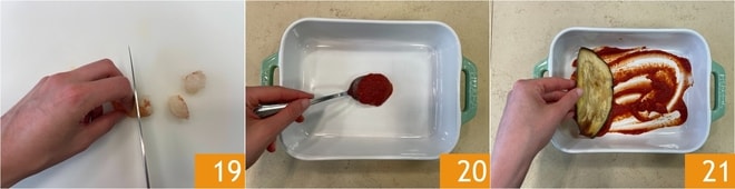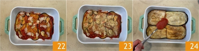 Nehmen Sie die gereinigten Garnelen und schneiden Sie sie in Stücke 19. Alles ist bereit, um den Parmesan zusammenzustellen: Nehmen Sie eine ofenfeste Form von 25x18 cm, verteilen Sie eine erste Schicht Sauce auf dem Boden 20, dann legen Sie die frittierten Auberginen darauf 21 und bedecken Sie sie erneut mit der Tomatensauce.