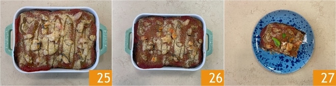 Beenden Sie die letzte Schicht mit den Semmelbröseln und einem Spritzer Olivenöl 25. Backen Sie im vorgeheizten statischen Ofen bei 180° für 25 Minuten. Nehmen Sie Ihren Meeres-Parmesan aus dem Ofen, lassen Sie ihn leicht abkühlen und servieren Sie ihn, indem Sie das Gericht mit frischen Basilikumblättern duften lassen 27!