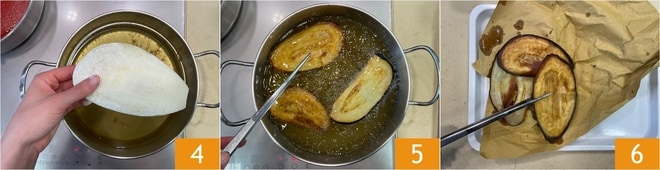 Wenn das Öl 170° erreicht hat, tauchen Sie die bemehlten Auberginenscheiben ein 4. Braten Sie sie für einige Minuten bis zur goldbraunen Farbe 5, dann heben Sie sie auf einem mit Küchenpapier ausgelegten Tablett ab 6.