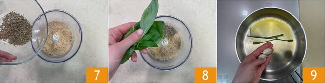 Jetzt bereiten Sie die Kräuter-Semmelbrösel vor: Geben Sie die Semmelbrösel, den Oregano 7 und die Basilikumblätter 8 in die Küchenmaschine. Mixen Sie alles zusammen und legen Sie es beiseite. Gehen Sie zu den Schalentieren über: Erhitzen Sie das Öl mit dem Knoblauch und den Petersilienstängeln in einer Pfanne 9. Lassen Sie es einige Sekunden anbraten.