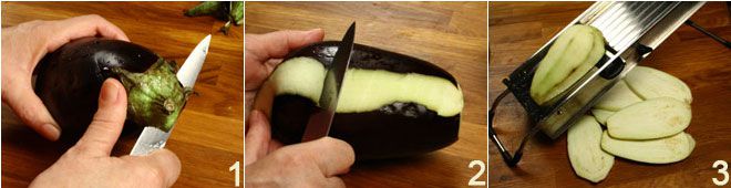 Schneiden Sie die Enden ab 1, waschen und trocknen Sie die Auberginen, dann schälen Sie sie 2 und schneiden sie in etwa ½ cm dicke Scheiben 3.