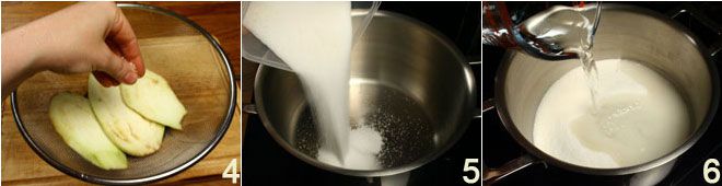 Bestreuen Sie sie mit grobem Salz 4 und lassen Sie sie in einem Sieb Wasser ziehen, auf das Sie einen Teller mit einem Gewicht legen. Lassen Sie sie auf diese Weise mindestens anderthalb Stunden stehen. In der Zwischenzeit geben Sie 500 g Zucker 5 und 250 ml Wasser 6 in einen Topf; bringen Sie es unter Rühren zum Kochen, bis sich der Zucker vollständig aufgelöst hat.