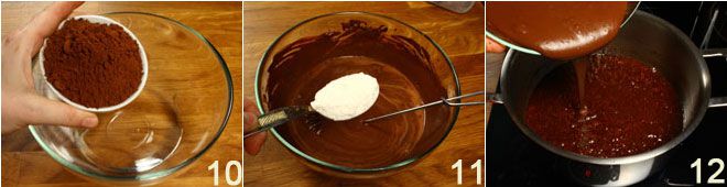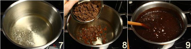 Kochen Sie den Sirup einige Minuten 7, achten Sie darauf, dass er nicht karamellisiert, und fügen Sie dann die gehackte Schokolade hinzu 8 und rühren Sie, bis auch sie geschmolzen ist 9.