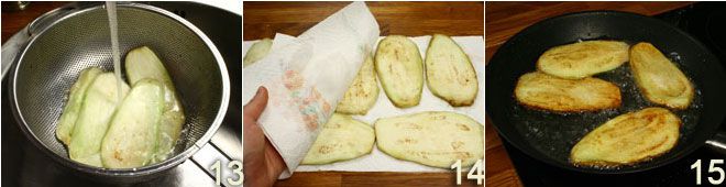 Nach der erforderlichen Zeit, spülen Sie die Auberginen ab 13, trocknen sie 14 und frittieren sie in reichlich Öl 15, bis sie goldbraun sind, dann legen Sie sie auf Küchenpapier, um das überschüssige Öl aufzusaugen.