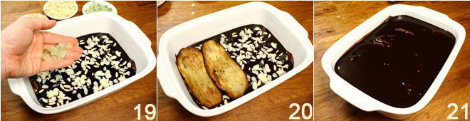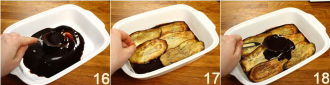 Nehmen Sie eine Auflaufform und geben Sie ein wenig Schokoladencreme auf den Boden 16; beginnen Sie die Auberginenscheiben dicht nebeneinander zu legen, um eine erste Schicht zu bilden 17, die Sie mit Creme bedecken 18.