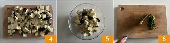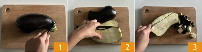 Um die Auberginen in der Heißluftfritteuse zuzubereiten, beginnen Sie damit, die Auberginen zu waschen. Dann legen Sie sie auf ein Schneidebrett und entfernen die Enden 1. Schneiden Sie die Auberginen zuerst in Scheiben 2, dann in Stifte, und schließlich beginnen Sie, sie in mehr oder weniger gleichmäßige Würfel von etwa 1 cm zu schneiden 3.