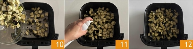 Verteilen Sie die Auberginen dann im Korb der Heißluftfritteuse. Sie können Backpapier verwenden, aber nur, wenn Sie spezielles, gelochtes Papier haben 10, andernfalls können Sie darauf verzichten. (Wir haben eine Fritteuse mit einer Kapazität von 6,5 Litern verwendet). Sobald die Auberginen im Korb platziert sind, besprühen Sie sie mit Ölspray oder giessen Sie etwas Öl darüber 11 12.
