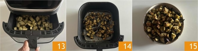 Garen Sie dann die Auberginen bei 200° für etwa 15 Minuten, überprüfen Sie sie in der Mitte der Garzeit 13 und mischen Sie sie bei Bedarf. Die Zeiten können je nach Fritteuse und Größe der Auberginen leicht variieren, beurteilen Sie die Bräunung und sobald sie goldbraun sind, sind sie fertig 14. Überführen Sie sie in eine kleine Schüssel und servieren Sie Ihre Auberginen in der Heißluftfritteuse 15.