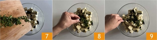 Geben Sie das frisch gehackte in die Schüssel mit den Auberginen 7. Fügen Sie dann eine Prise Salz hinzu 8 und mischen Sie alles gut in der Schüssel 9.