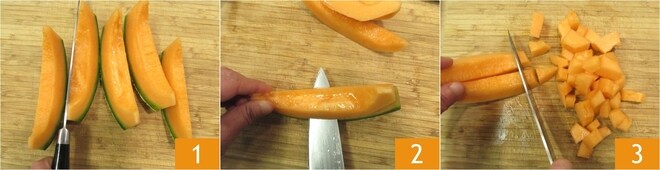 Um den Melonenlikör zuzubereiten, schneiden Sie zuerst die Melone in Scheiben 1, entfernen Sie die Kerne und die Schale 2 und schneiden Sie das Fruchtfleisch in Würfel 3. Sie benötigen etwa 340 g Melonenfruchtfleisch.
