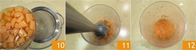 In der Zwischenzeit seihen Sie die Melone ab 10 und bewahren Sie den Alkohol auf, pürieren Sie dann das Fruchtfleisch mit einem Stabmixer 11 zu einem Püree 12.