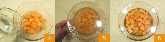 Geben Sie die Melone in eine Schüssel und bedecken Sie sie mit dem Alkohol 4, dann verschließen Sie sie mit Frischhaltefolie 5 und lassen Sie sie 8 Tage bei Raumtemperatur ziehen, wobei Sie einmal täglich umrühren 6.
