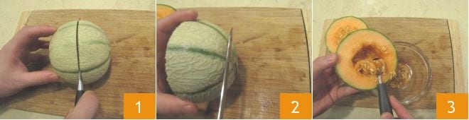 Um die mit Früchten und Eis gefüllte Melone zuzubereiten, beginnen Sie damit, jede Melone in zwei Hälften zu schneiden 1. Schneiden Sie dann die Kappe von beiden Hälften ab 2, um eine Standfläche für die Melonenschalen zu schaffen. Entfernen Sie mit einem Löffel oder einem Kugelausstecher die Kerne und Fasern aus dem Inneren der Melone 3.