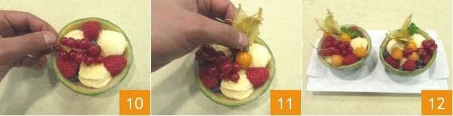 Verteilen Sie die Melonenkugeln und die roten Früchte in den Schalen und fügen Sie die Himbeeren hinzu. Dekorieren Sie schließlich jede Schale mit einem Zweig Johannisbeeren 10, einer Physalis 11 und einem Minzblatt. Ihre mit Früchten und Eis gefüllte Melone ist servierfertig 12!