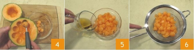 Mit dem speziellen Kugelausstecher das Fruchtfleisch der Melone zu Kugeln formen 4 und in eine Schüssel geben. Die Melonenbällchen mit Grand Marnier beträufeln 5 und etwa 30 Minuten marinieren lassen. Nach der erforderlichen Zeit die Melone aus der Marinade nehmen 6 und in eine Schüssel geben.